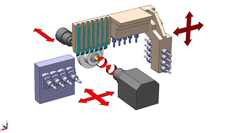 ●標(biāo)準(zhǔn)的橫向排刀結(jié)構(gòu)、合理緊湊的刀具布局,刀具配置靈活,高剛性的機(jī)體結(jié)構(gòu)使機(jī)床具備高穩(wěn)定性、高速高精度、高復(fù)合化等優(yōu)點(diǎn),為客戶提供高效率的車、銑復(fù)合加工能力。