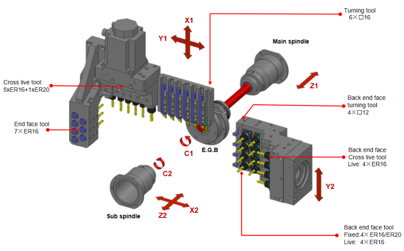 ●The sub spindle tool has: turning, side milling, front eccentric processing, boring processing, fully realize the main spindle and sub spindle processing capacity at the same time, efficient production;