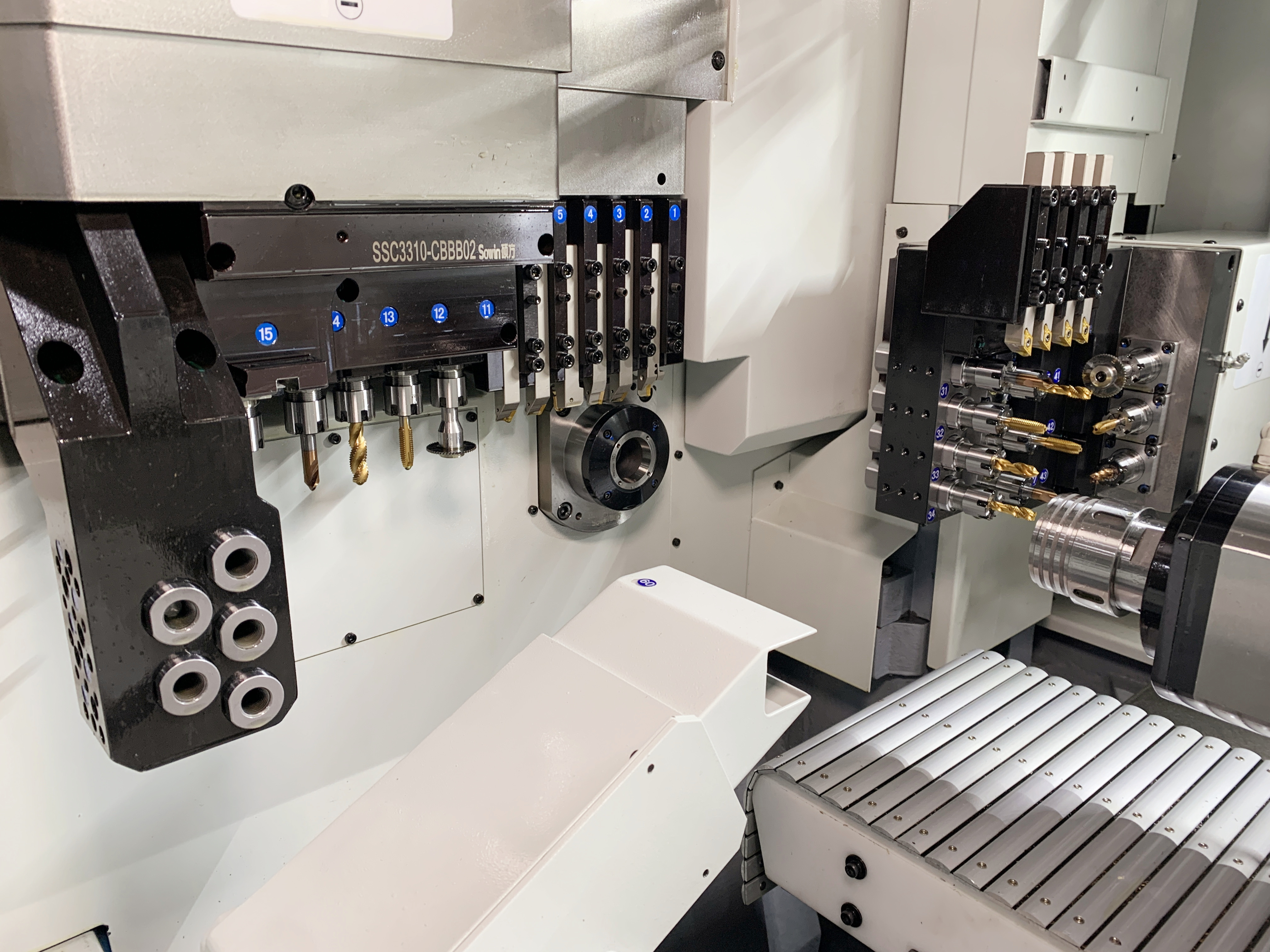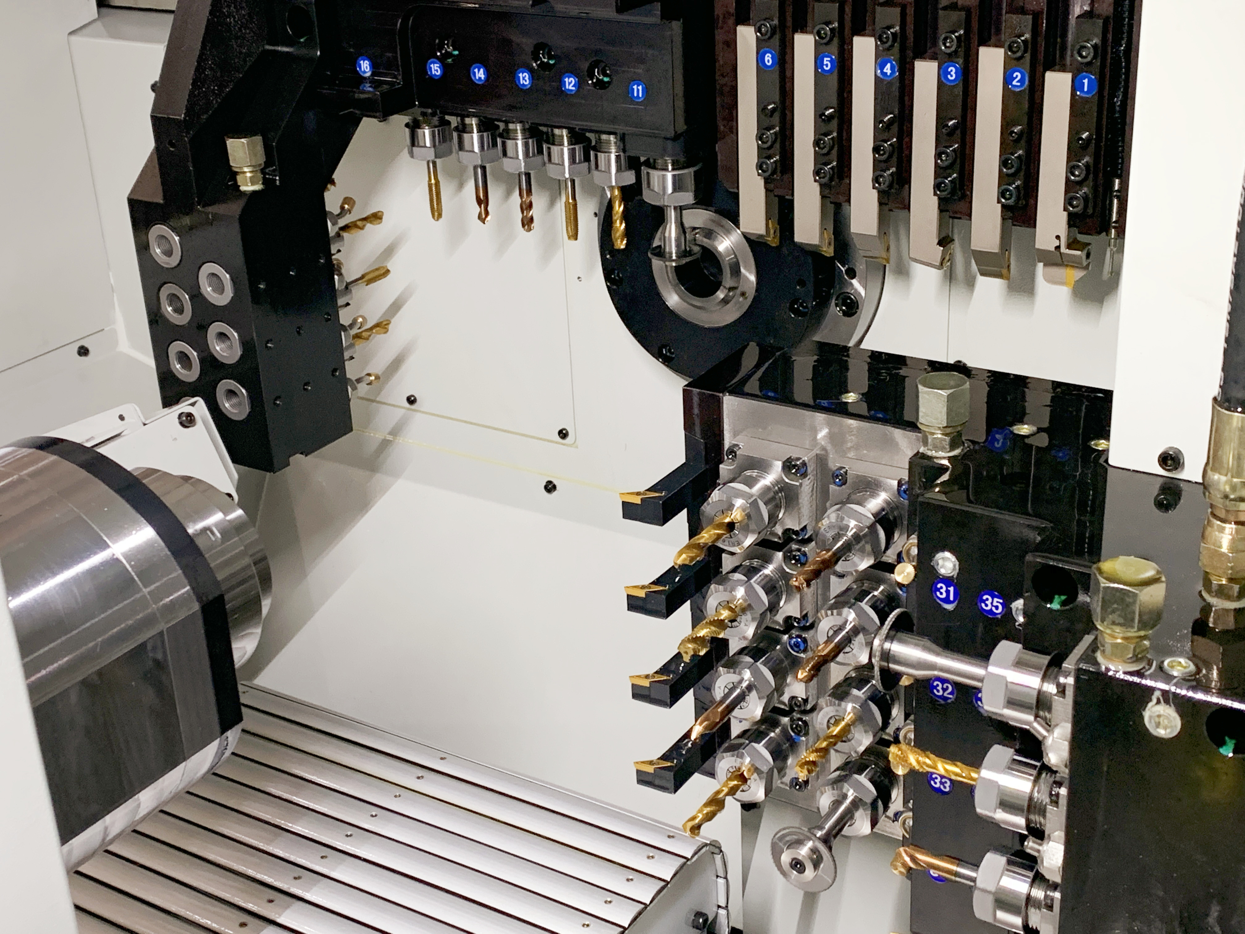 ●背軸刀臺刀具具備:車削、側(cè)面銑削、正面偏心加工、鏜孔加工,完全實(shí)現(xiàn)主背軸同時(shí)加工能力,高效生產(chǎn);