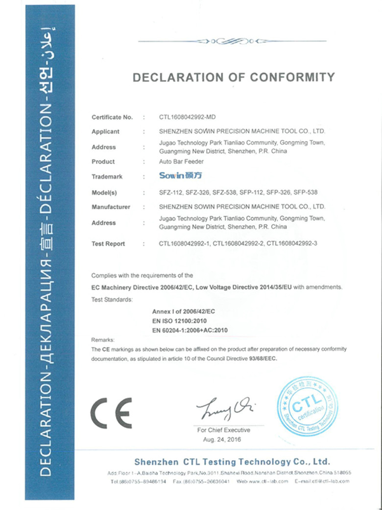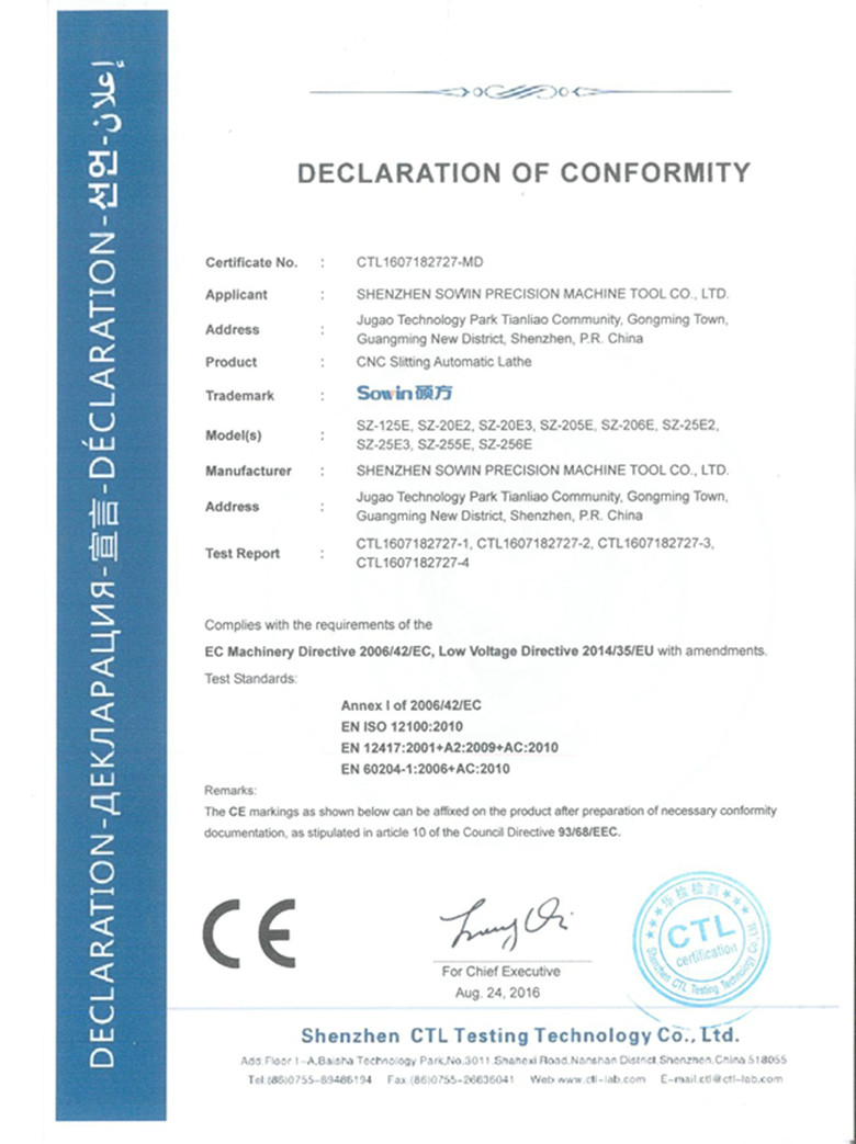 熱烈祝賀碩方走心機(jī)產(chǎn)品獲得CE認(rèn)證證書(shū)。 為順應(yīng)出口國(guó)際市場(chǎng)對(duì)產(chǎn)品質(zhì)量的要求,滿足我司產(chǎn)品海外銷(xiāo)售的需要,為碩方走心機(jī)進(jìn)軍海外市場(chǎng)鋪平道路,碩方走心機(jī)產(chǎn)品在2016年8月已順利通過(guò)CE認(rèn)證(見(jiàn)下圖)。